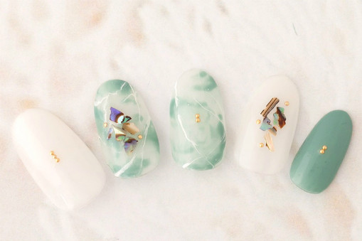 爽やかなミントカラーのニュアンスネイル。ちりばめたクラッシュシェル華やかなデザイン。